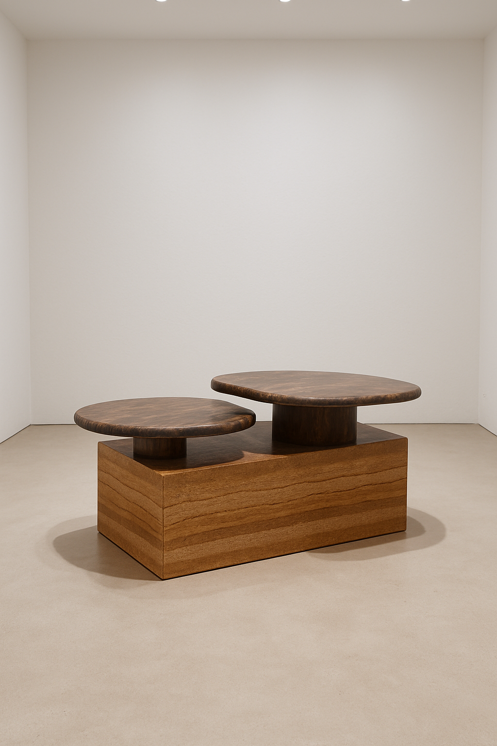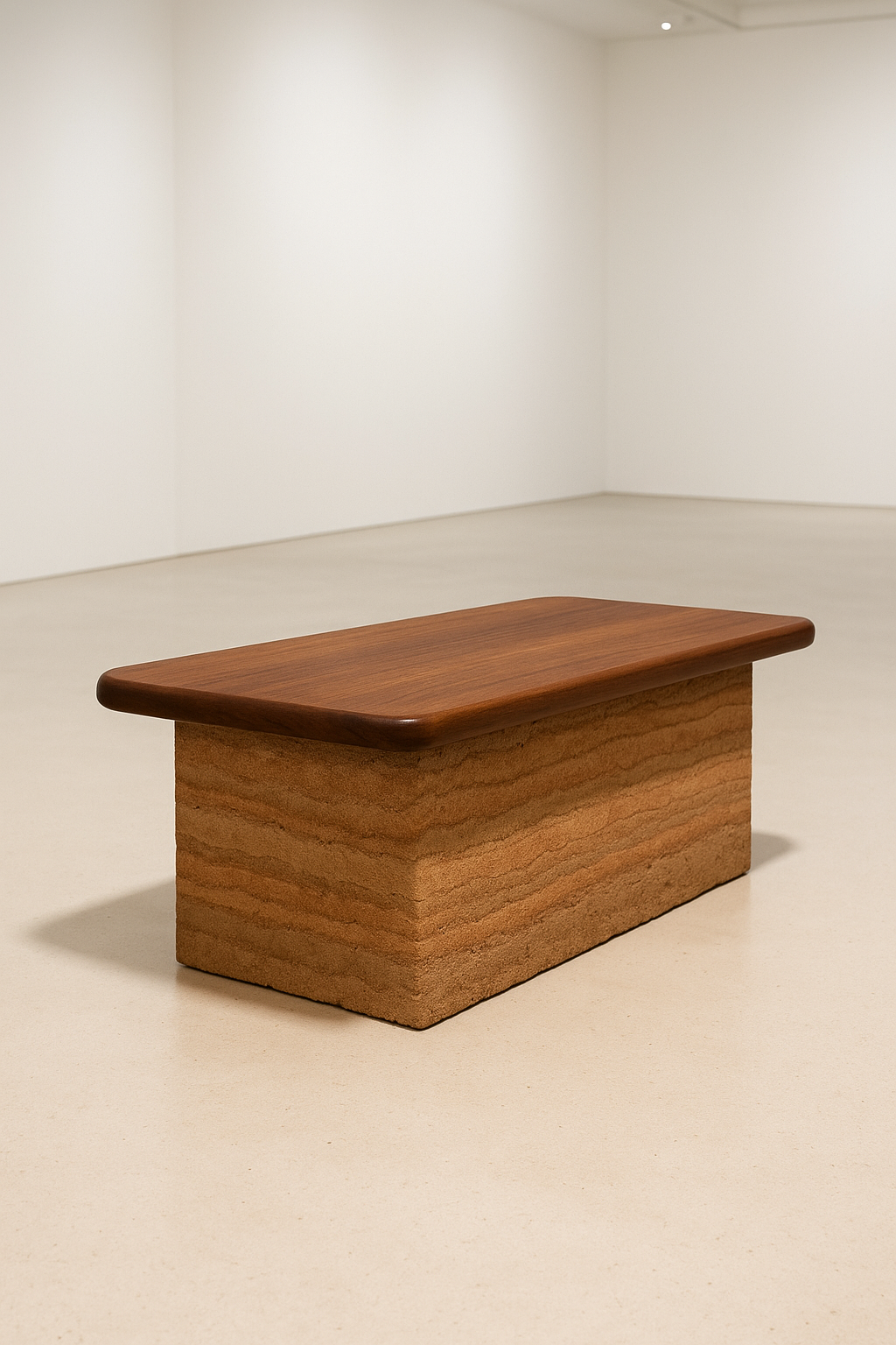 The Khruangbin is the material equivalent of a musical climax. A harmonious mixture of rich materials growing from the ground to achieve its heights. It is a centerpiece that makes a statement in any setting. Crafted from rammed earth, oak wood, and a rich dark marble, the piece balances raw, earthen mass with the refined elegance of carved stone. The two-tiered design features two organically shaped marble tops resting on cylindrical bases, elevated from a solid rammed earth plinth. Designed as both functional furniture and an artistic statement, the Crescendo invites contemplation, tactile engagement, and an endless array of different uses.
